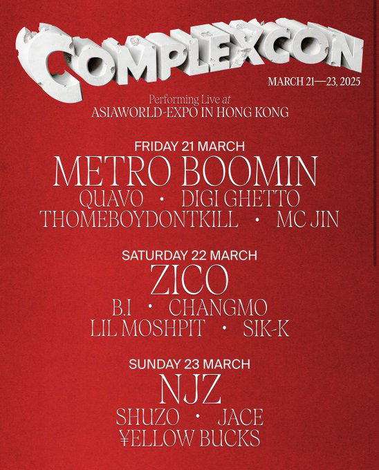 除了NJZ外,今年ComplexCon音樂節的陣容強大,包括美國饒舌歌手Metro Boomin;韓國嘻哈代表Zico、B.I、Sik-K、Changmo;香港則有Mirror小分隊成員AK、Lokman、Anton及Frankie、陳凱詠(Jace)、MC Jin;以及日本DJ兼模特兒大平修藏(SHUZO)等。