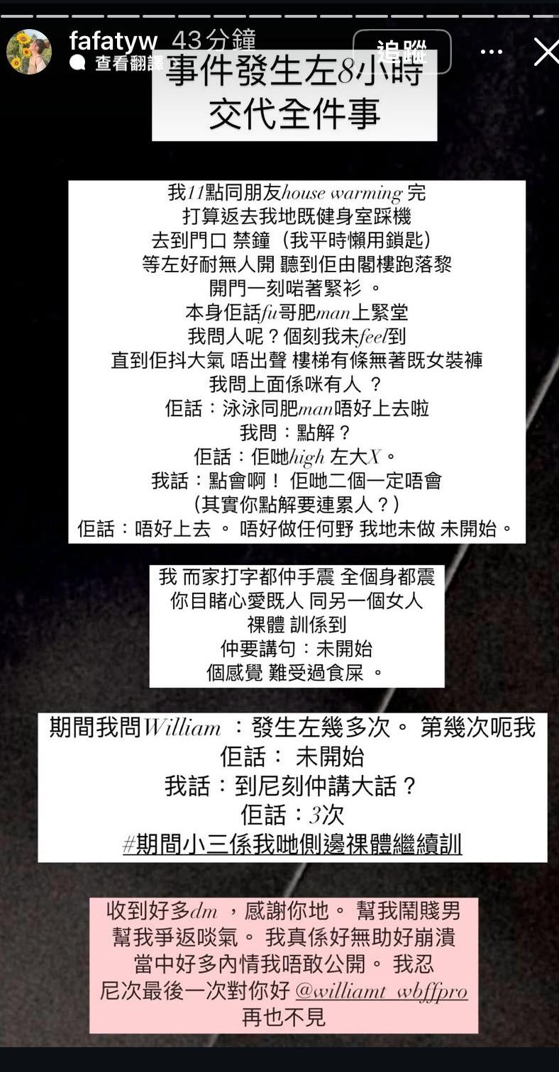 FaFa Tse提到事件隨後發展,「本身佢話Fu哥肥man上緊堂,我問人呢?嗰刻我未feel到,直到佢唞大氣唔出聲,樓梯有條無著嘅女裝褲,我問上面係咪有人?佢話:泳泳同肥man唔好上去啦。我問:點解?佢話:佢哋high咗大X。我話:點會啊!佢哋二個一定唔會(其實你點解要連累人?)佢話:唔好上去。唔好做任何嘢,我哋未做 未開始。」