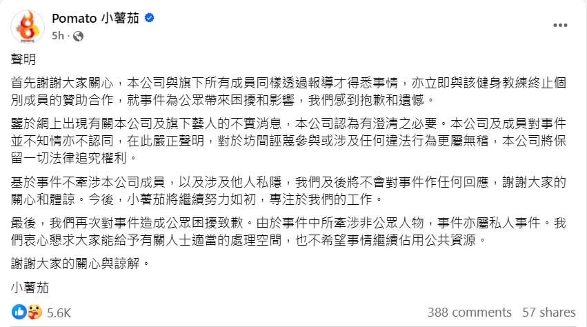 基於事件不牽涉本公司成員,以及涉及他人私隱,我們及後將不會對事件作任何回應,謝謝大家的關心和體諒。今後,小薯茄將繼續努力如初,專注於我們的工作。