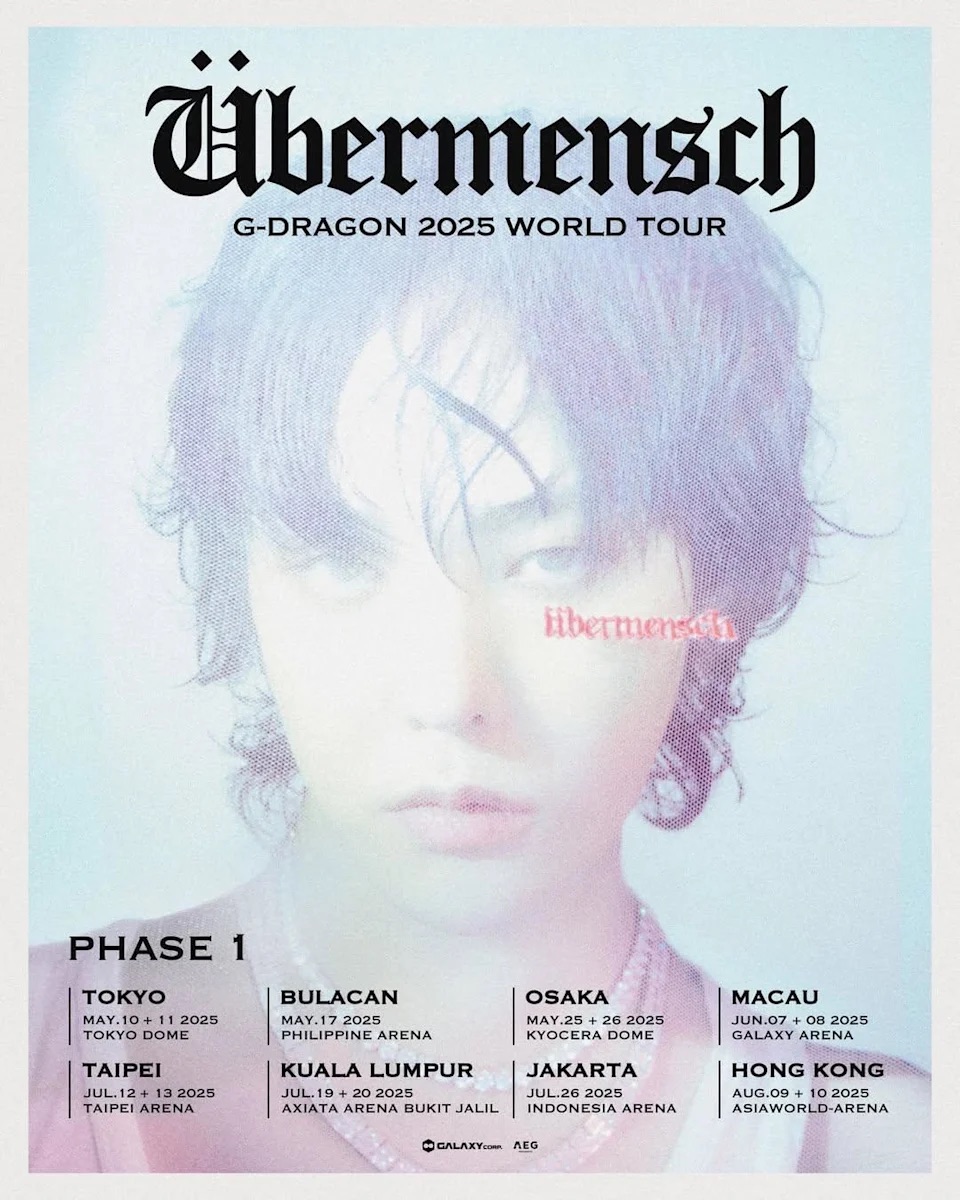 BIGBANG隊長G-Dragon在社交平台無預警發文,公布其第三次世界巡迴演唱會「G-DRAGON 2025 WORLD TOUR【Übermensch】」的首階段詳情。演唱會3月29日至30日在首爾高陽體育場掀起序幕,5月將登陸日本東京巨蛋,一路前往馬尼拉、大阪、台北、馬來西亞等地。其中,香港站將於8月9至10日在亞洲國際博覽館ARENA舉行;而澳門站則在6月7至8日在銀河綜藝館舉行。而香港站更是目前公布的各站場次中的尾場!距離上一次GD來港開個人演唱會,已經是2017年的事,V.I.P.「等到頸都長」,終於都等到!