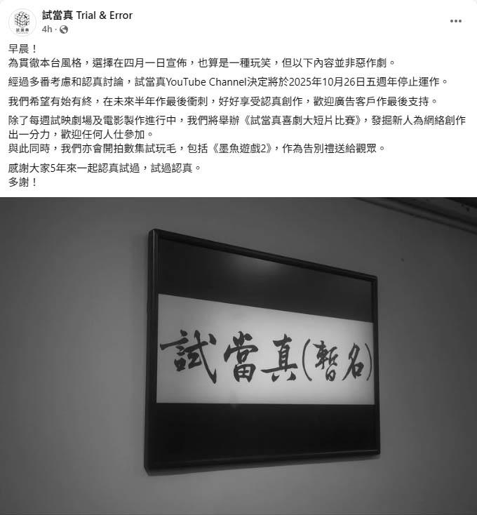 經過多番考慮和認真討論,試當真YouTube Channel決定將於2025年10月26日五週年停止運作。我們希望有始有終,在未來半年作最後衝刺,好好享受認真創作,歡迎廣告客戶作最後支持。