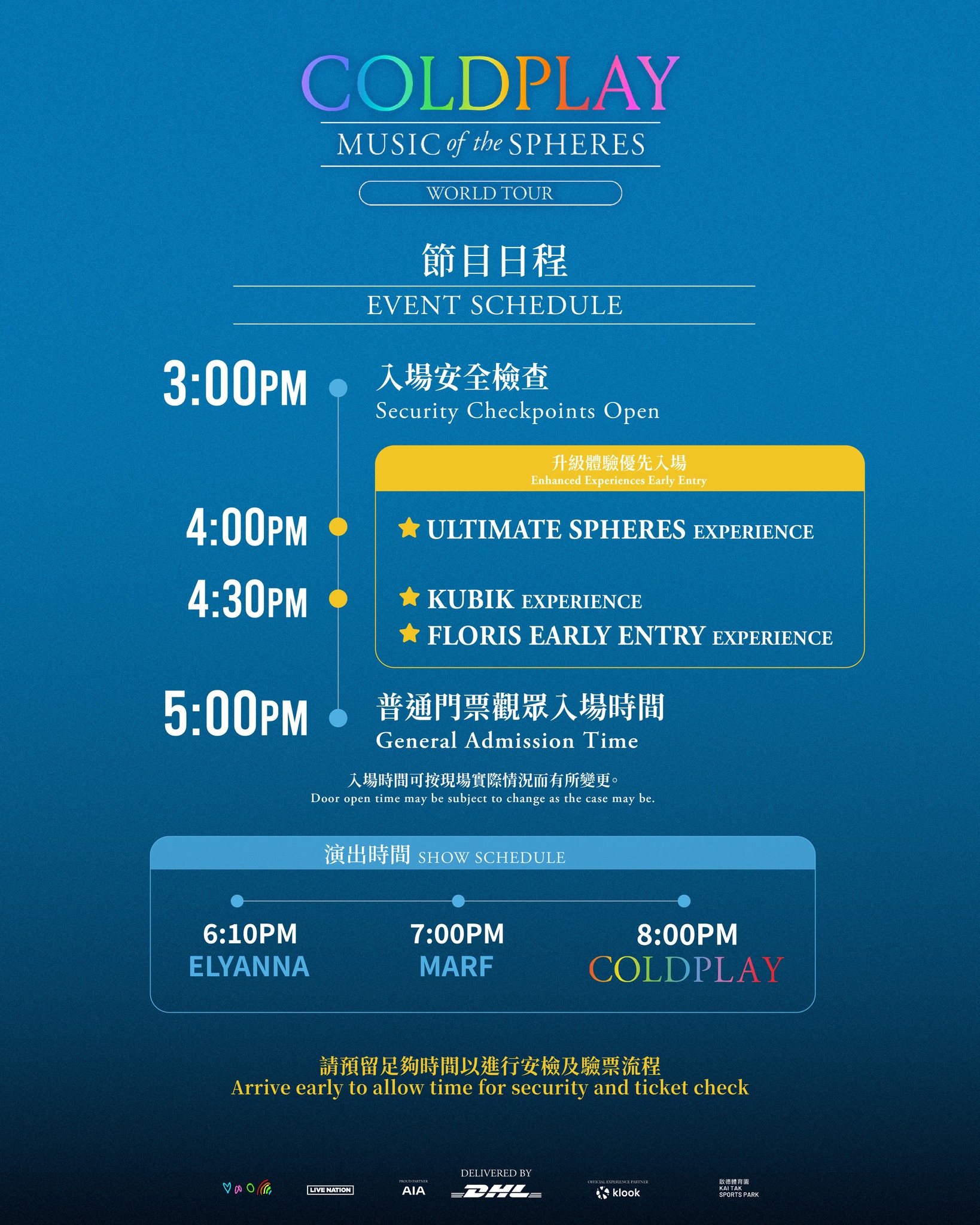 Coldplay 演唱會安檢將由下午3時開始,入場時間則因應門票類別有不同: