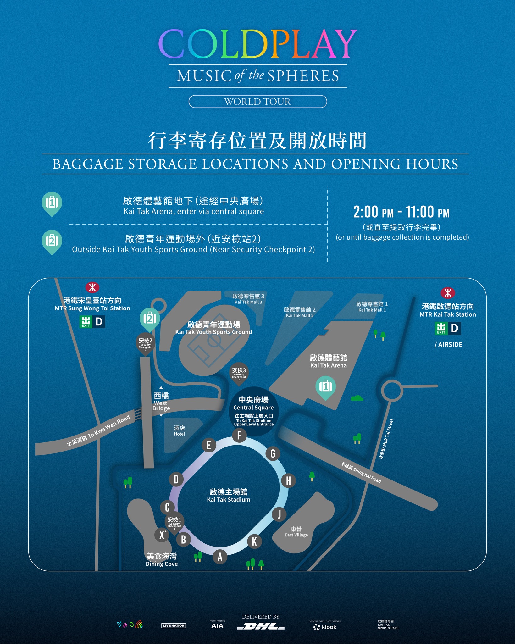 觀眾可將行李寄存在啟德體藝舘地下(途經中央廣場)或啟德青年運動場外(近安檢站2),寄存時間為下午2時至夜晚11點。行李尺寸小於56X36X23CM,收費為每件港幣80元;行李尺寸大於56X36X23CM,收費為每件港幣140元。