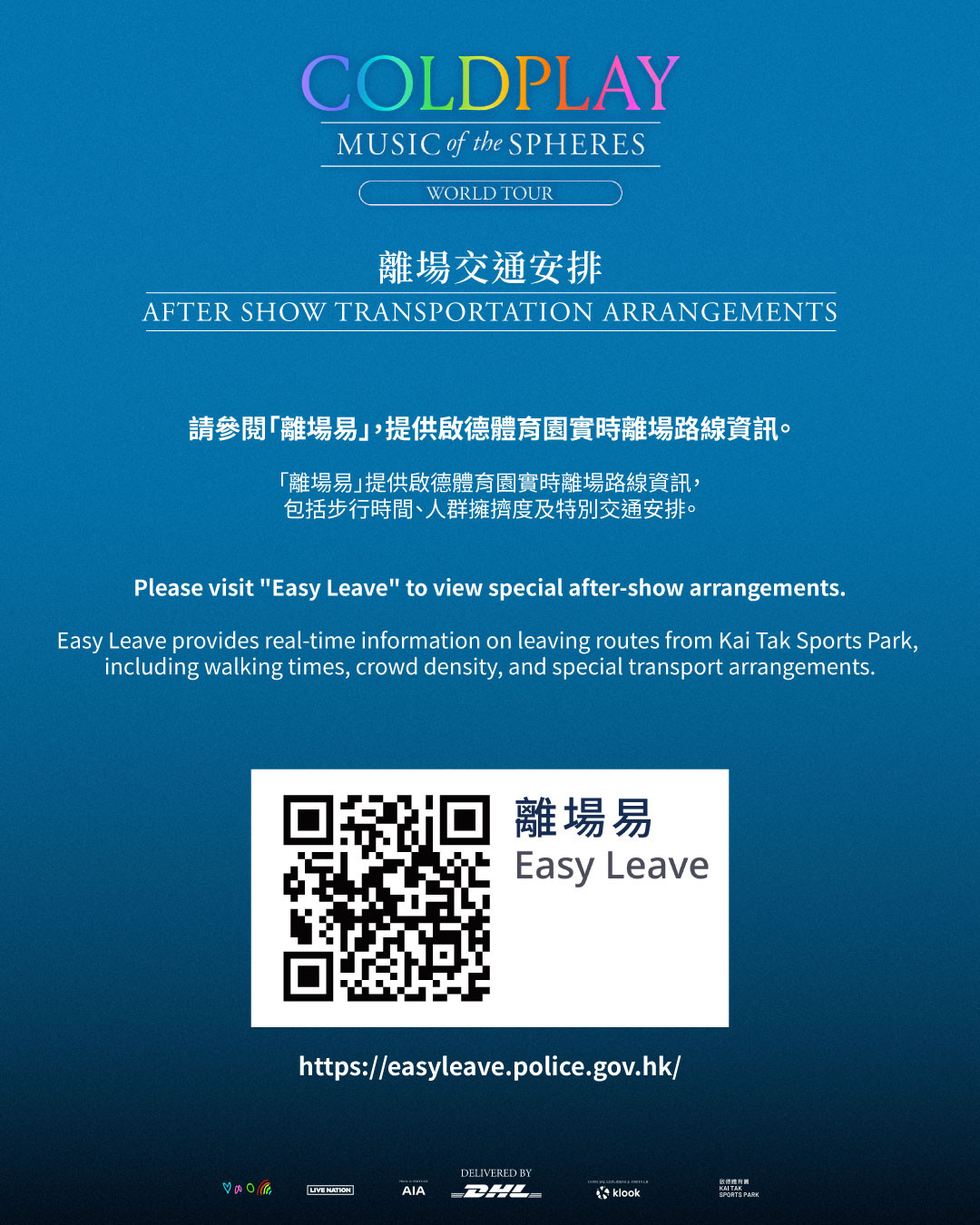 觀眾當日演出完畢後可參閱「離場易」了解更多實時離場路線資訊。