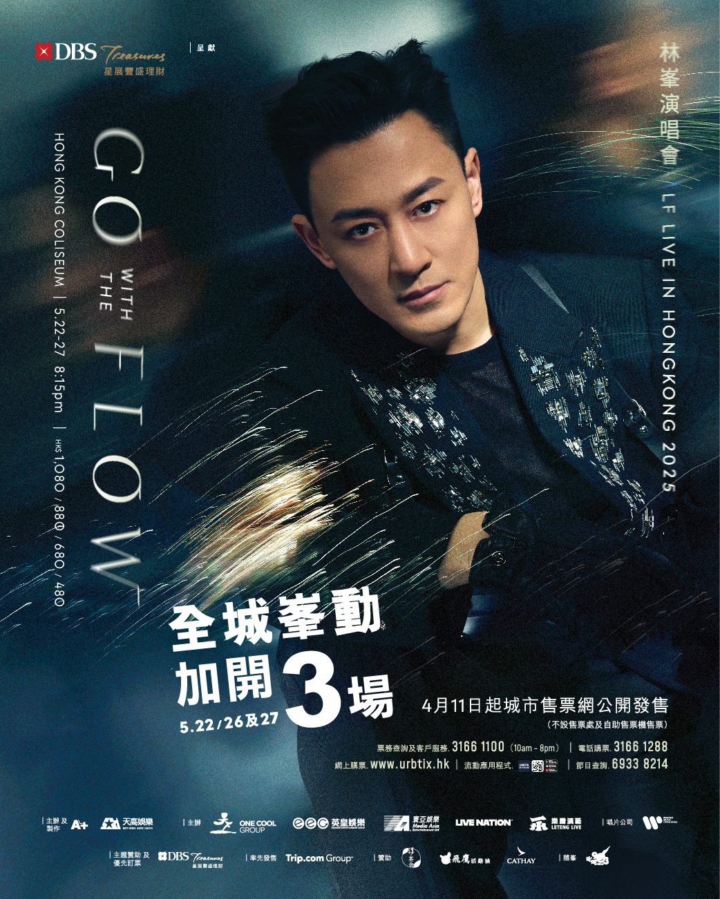 【Now.com】林峯相距9年後,將在5月於紅館再舉行個唱《GO WITH THE FLOW 林峯演唱會 LF LIVE IN HONG KONG 2025》。消息甫公布即掀撲飛熱,5月23、24、25日的3場演唱會門票日前接受優先訂票,火速售罄。主辦方今日(9日)宣布一口氣加開3場(5月22、26、27日),即下月個唱共開足6場,打破林峯入行以來的演唱會場次紀錄!門票將於11日(五)早上10時於城市售票網公開發售。