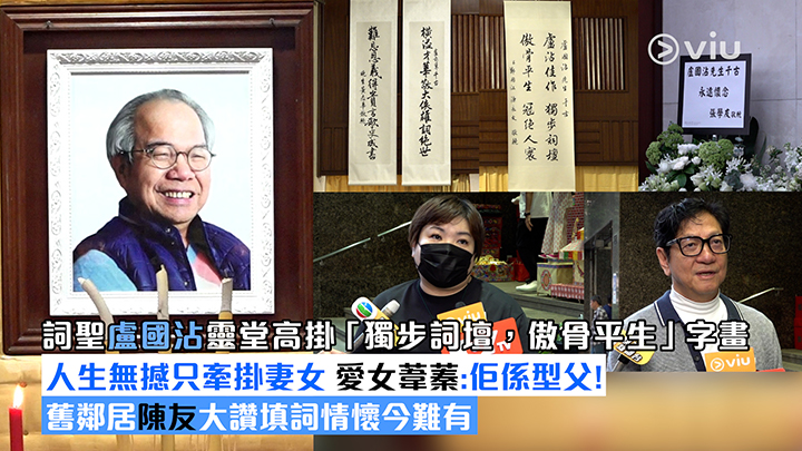 【Viu】有「樂壇詞聖」之稱的沾Sir盧國沾上月中於睡夢中離世,享年76歲!其家人今日於紅磡世界殯儀館為其設靈,喪禮以佛教儀式進行,靈堂佈置簡潔清雅,遺孀廖劍蘭及女兒葦蓁的心型花牌放置於中央,靈堂旁高高掛著「盧沾佳作,獨步詞壇,傲骨平生,冠絕人寰」、「橫溢才華敬大俠雄詞絕世」、「難忘恩義得貴言歌史成書」等輓聯及字畫!