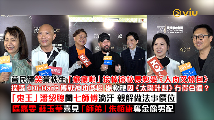 【Viu】《第33屆香港舞台劇獎頒獎禮》今晚喺灣仔舉行,風車草黑心喜劇《Di-Dar》共獲8項提名,主演葛民輝、梁祖堯、Ahdee湯駿業同邵美君都有出席,「橋王」阿葛仲拎埋把尺嚟「度橋」,笑爆全場!「葛校長」爆笑回應《Di-Dar(Comeback)》搵咗黃秋生演校長一角,笑言可能破完地獄變「人肉叉燒包」,仲建議阿祖同Ahdee出叉燒包紀念品,甚至移師專做神功戲嘅戲棚加場,大癲呀!