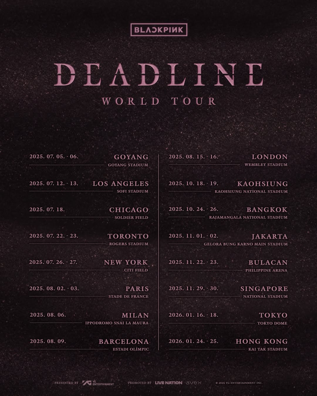 BLACKPINK所屬的YG娛樂創辦人梁鉉錫日前公布,BLACKPINK今年會推出新歌,並在7月起在南韓首爾展開第3次世界巡迴演唱會《DEADLINE》。27日(二),BLACKPINK的社交平台公布巡演詳情,追加亞洲巡演場次,包括高雄﹑雅加達﹑馬尼拉﹑曼谷、新加坡、東京及香港站的場次。其中,BLACKPINK四女將於2026年1月24及25日襲港,在啟德體育園主場館舉行一連2場演唱會!是繼NCT DREAM後第2隊宣布在啟德主場館開騷的南韓偶像團體。