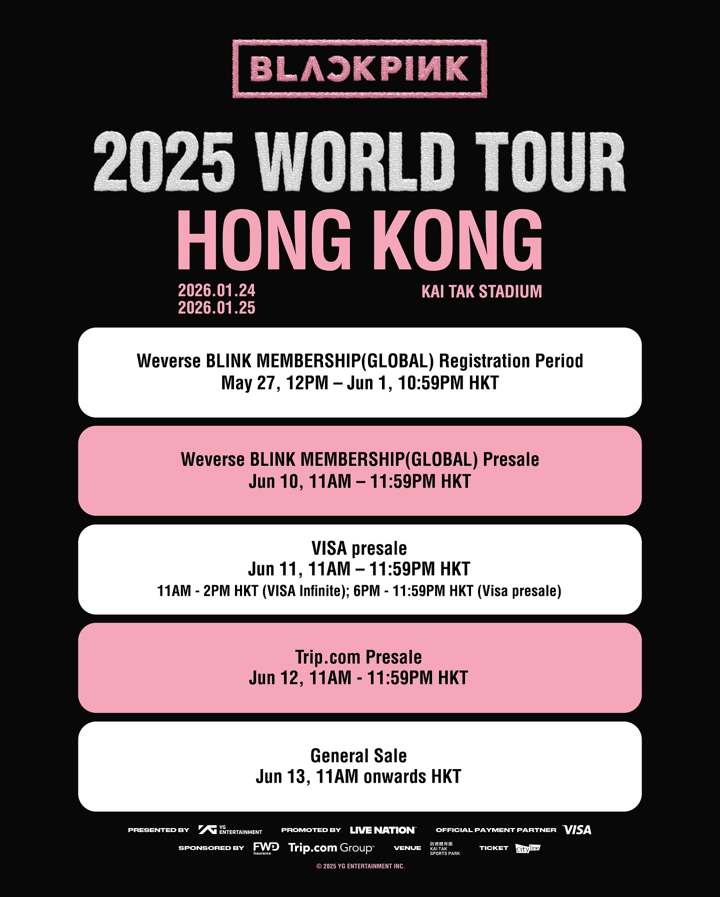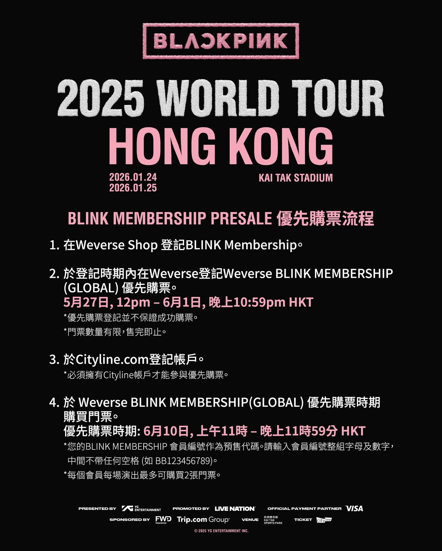 門票於即日起至6月1日晚上10時59分,接受於Weverse Shop上購買BLINK Membership的會員優先登記,成功登記後可於6月10日上午11時至晚上11時59分優先購票。隨後兩日接受信用卡用戶優先購票,門票將於6月13日上午11時起公開發售。Now.com將為大家繼續帶來巡演的最新資訊,BLINK們記得鎖定Now.com!