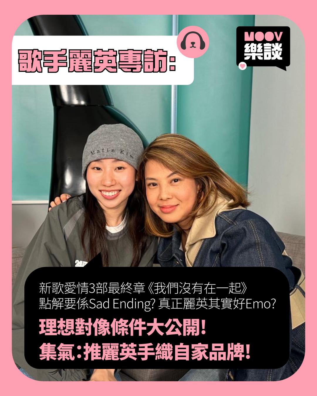 二人又提及2023年12月舉行的麗英首個個人音樂會《MOOV Live 麗英》,麗英表示此回憶畢生難忘:「係成長大集匯。開心之餘,亦都有痛苦存在。我喺到諗,到底我係咪真係做到呢?有好多自我懷疑,但我好多謝呢場騷,我發覺自己真係大個左好多,對自己自信左,亦都明白身邊有好多人好錫我, 所以我要更加努力去做我而家想做嘅嘢。」