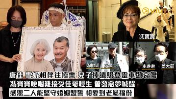 約9時20分,狄龍與太太陶敏明、「徒弟」姜大衞與太太李琳琳、馮寶寶先後抵殯儀館。馮寶寶受訪哽咽表示唐佳、雪妮是她尊敬的合作夥伴,又憶起獲雪妮邀請做伴娘往事,她坦言難以接受唐佳墮樓這個決定,覺得好突然。不過馮寶寶指二人一直都能堅守當年婚姻盟誓:「可以相伴到老,陪住一齊走,都係福份。」她又謂雪妮由患病至離開是短時間內發生,並非外界所講病了幾年,最後馮寶寶表示曾發惡夢喊醒,但就未有透露是否夢見故友。