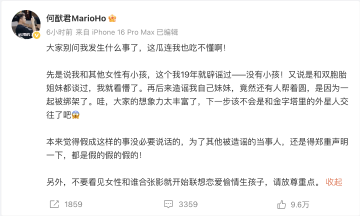 事件引起網民熱議,何猷君今日(31日)在微博發文回應,指網絡流言荒謬:「大家別問我發生甚麼事了,這瓜連我都不懂啊!先是說我和其他女性有小孩,這個我19年就闢謠過──沒有小孩!又說是跟雙胞胎姊妹都談過,我就看懵了。再後來造謠我自己妹妹,竟然還有人幫忙圓,是因為一起被綁架了。哇,大家的想像力太豐富了,下一步該不會是跟金字塔裏的外星人交往了吧。本來覺得假成這樣的事沒必要說話的,為了其他被造謠的當事人,還是得鄭重聲明一下,都是假的假的假的!另外,不要看見女性和誰合張影就開始聯想戀愛偷情生孩子,請放尊重點。」
