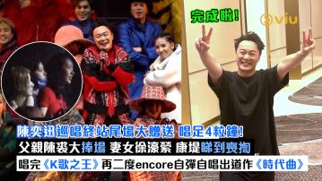 話晒都係終站尾場,點會咁易畀fans走?直接去encore部份!換上便服嘅Eason上台後即唱《K歌之王》,令全場fans超high!成個encore賣大包唱足11首歌,Eason都仲未覺攰,落返台冇幾耐就連人帶結他升返上嚟,二度encore!Eason話一直都唔知最後一首歌係唱邊首,最後佢決定揀,送返個驚喜畀fans!最終終站尾場唱足4粒鐘,182場世巡就咁圓滿結束!完場後Eason突現身後台會傳媒,舉起雙V興奮大叫完成!