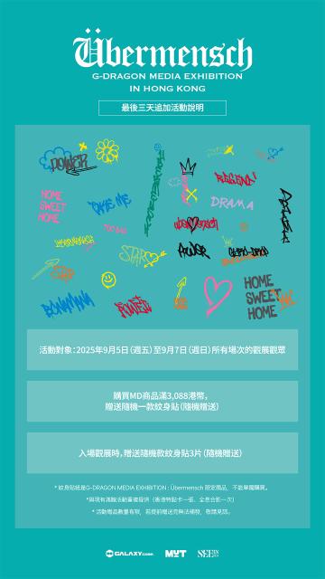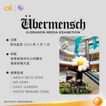《G-DRAGON MEDIA EXHIBITION : Übermensch》香港站展覽即日起至2025年9月7日舉行。csl公布,由即日起至9月7日,每位合資格客戶可領取藝術展覽門票(一套兩張總值HK$376)一次。客戶可自由選擇日期及參觀時段,平日設3個參觀時段(12:30/16:30/19:30),周末共設6個參觀時段(10:30/12:30/14:30/16:30/18:30/19:30)。csl用戶只需透過WhatsApp連結(http://bit.ly/45XDejv)登記即可參與優惠,數量有限,先到先得,送完即止。