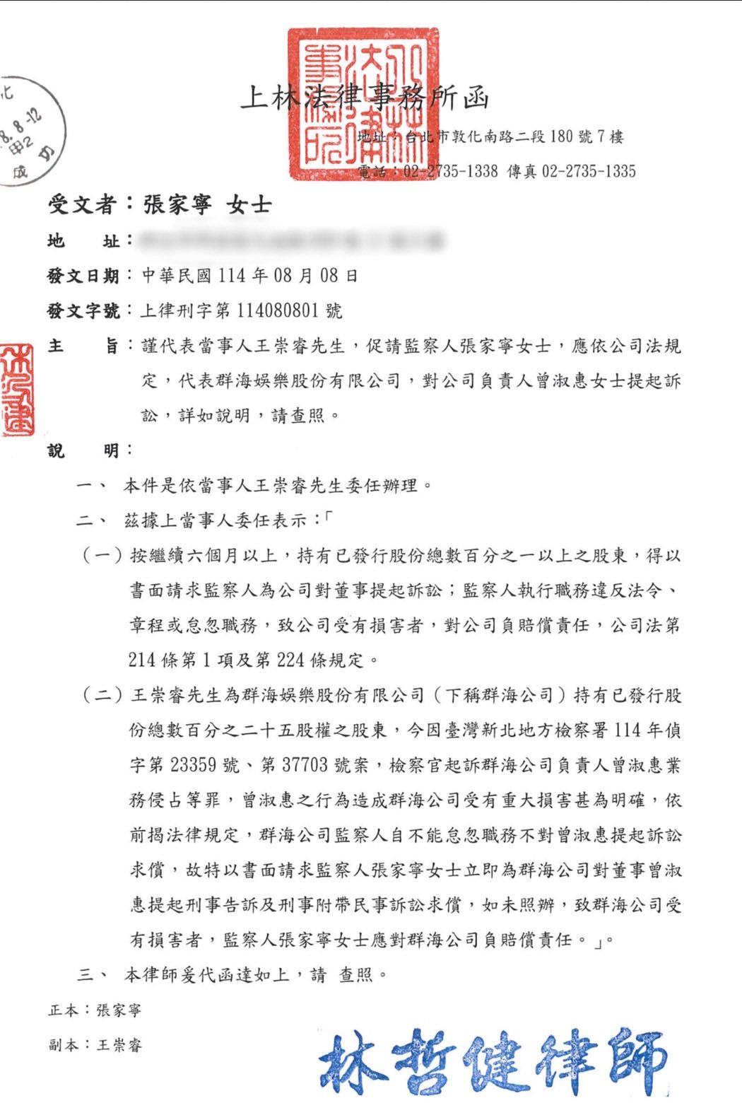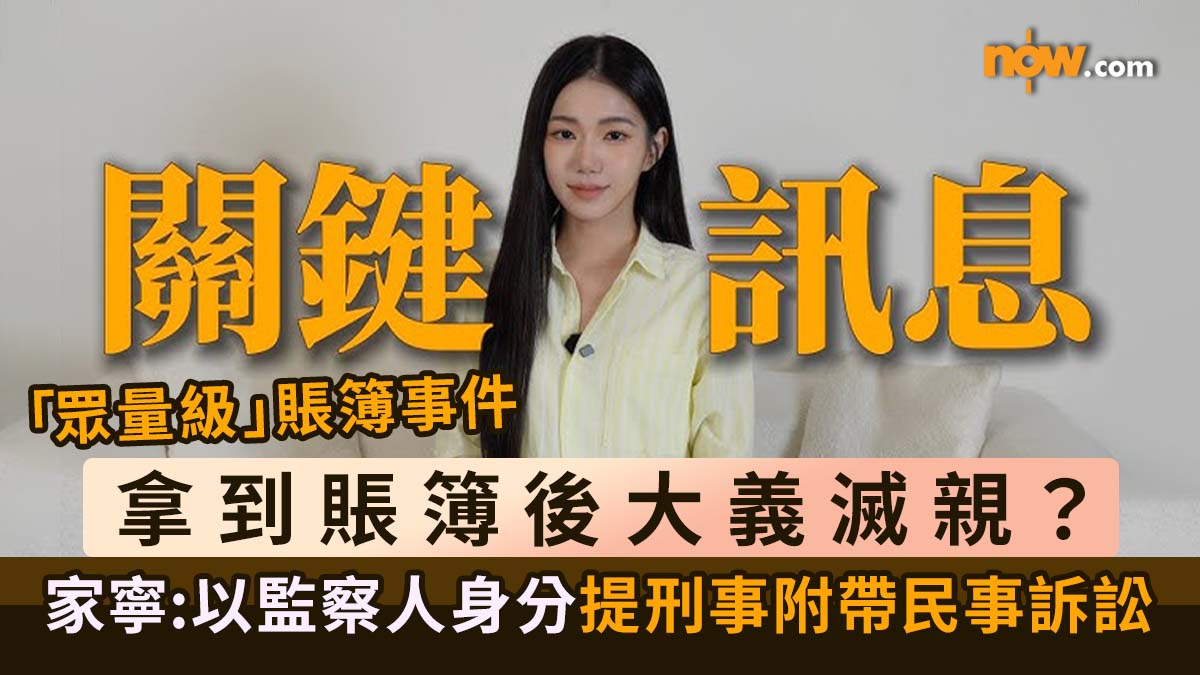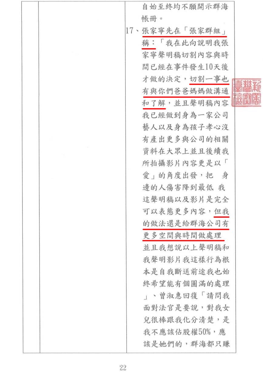 家寧在影片「家寧以監察人身分提起附帶民事訴訟」中表示,已經取得群海股份有限公司的賬本,將會親自查閱和查清完整資金流向,而且以群海娛樂監察人的身分,委託理鴻法律事務所郭柏鴻律師,向公司負責人(即張媽媽 曾淑惠)提起刑事附帶民事訴訟,以保障公司權益。