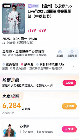 蘇永康演唱會原定10月6日於溫州奧體中心體育館舉行,票價199至699元人民幣,售票平台曾顯示「已售罄」狀態。總票代理大麥網今日 (16日) 將該場項目下架,平台已無法搜尋相關資訊。