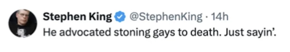 知名恐怖小說作家Stephen King在X發文,回應霍士新聞主持人Jesse Watters指柯克並非受爭議人物的帖文,表示「我只想說,柯克支持對同性戀者執行石刑」。帖文發布後,不少人指出這完全是錯誤的資訊,柯克從來沒有說過同性戀者應該被傷害或被殺。