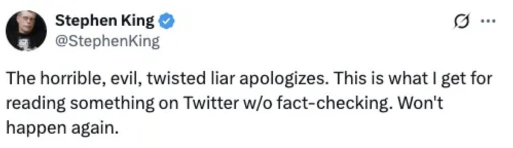 Stephen King隨後刪除了帖文,並再度發文表示為此事道歉,表示他只想展示出有些人會選擇性引用聖經經文。但此道歉帖文未能平息外界的批評。Stephen King及後再為事件道歉,承認自己沒有查證就將在X上的資訊當真,是自己做錯了,而且已經刪掉了內容失實的帖文。