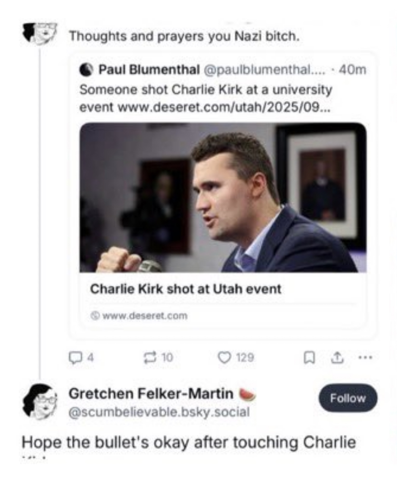 而除了Stephen King外,影視遊戲界亦有相似的情況。DC漫畫作家Gretchen Felker-Martin於社交媒體諷刺槍殺事件,稱柯克是納粹分子,並表示希望該顆子彈觸碰過柯克後沒有事。