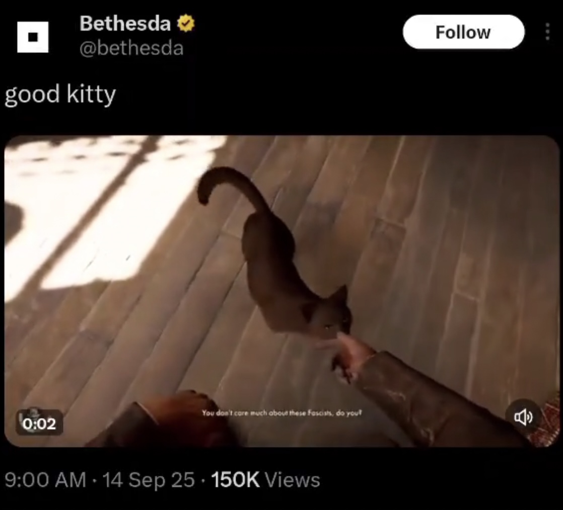 至於遊戲界,負責製作《Fallout》系列、《Skyrim》系列等知名遊戲系列的貝塞斯達(Bethesda)就在槍殺事件後發布影片,影片長約9秒,為《Indianna Jones》系列遊戲的片段,標題為「Good Kitty」,只見影片中的男人一邊撫摸黑貓,一邊說:「你不太在乎這些法西斯分子,對嗎?(You don’t care much about these Facists, do you?)」,疑似暗諷柯克為法西斯分子,所以他們不在乎柯克被殺。