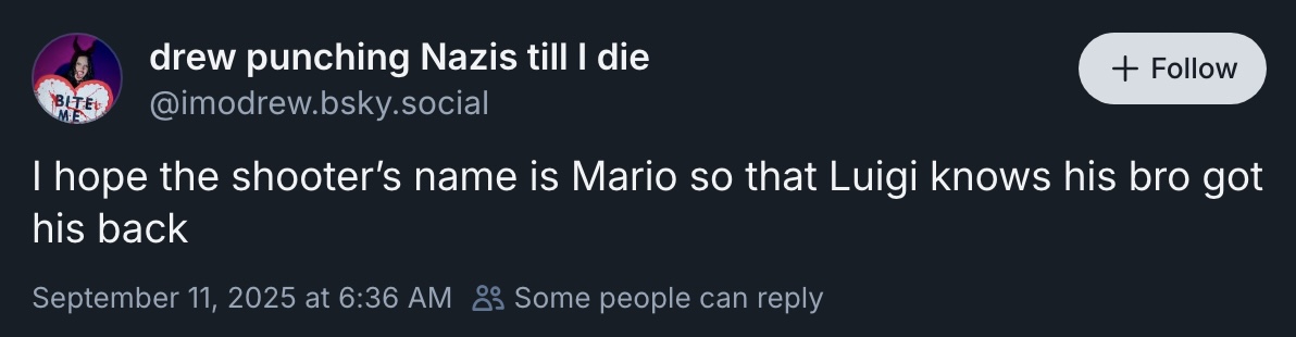 而負責製作《羊蹄山戰鬼Ghost of Yotei》的開發者Drew Harrison在事件發生後在社交媒體發文:「希望槍手的名字是Mario,那Luigi(暗指涉嫌槍殺聯合健康保險CEO的Luigi Mangione)就知道他的兄弟會支持他」。其後Drew更再度發文,指有大量網民聯絡他的僱主Sucker Punch Productions,並表示希望Drew被解僱。Drew再進一步回應,指他不會為自己的言論感到後悔:「如果對抗法西斯主義會讓我丟掉我的理想工作,我依然會這樣做。」