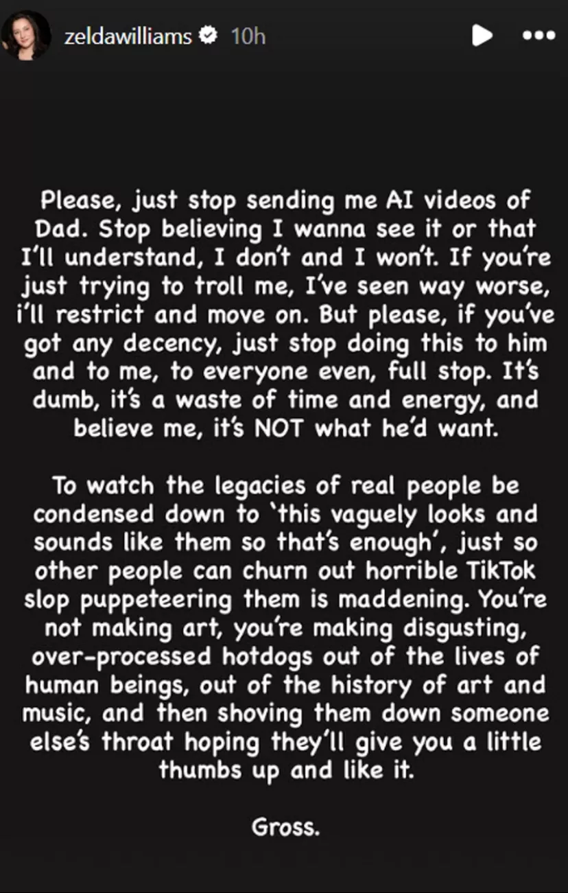據英國BBC及sky news報道,Zelda Williams於10月6日透過Instagram發佈限時動態,寫道:「請不要再傳AI生成的爸爸影片給我了。請不要以為我想看,或以為我能理解,我既不想,也不會理解。如果你只是想惡意挑釁,我看過更糟的,我會封鎖你然後繼續過我的生活。若你還想要一點體面,請停止這樣對待他和我,以及所有人。這種事太愚蠢了,浪費時間與精力。而且,相信我,這絕對不是他想看到的事。」