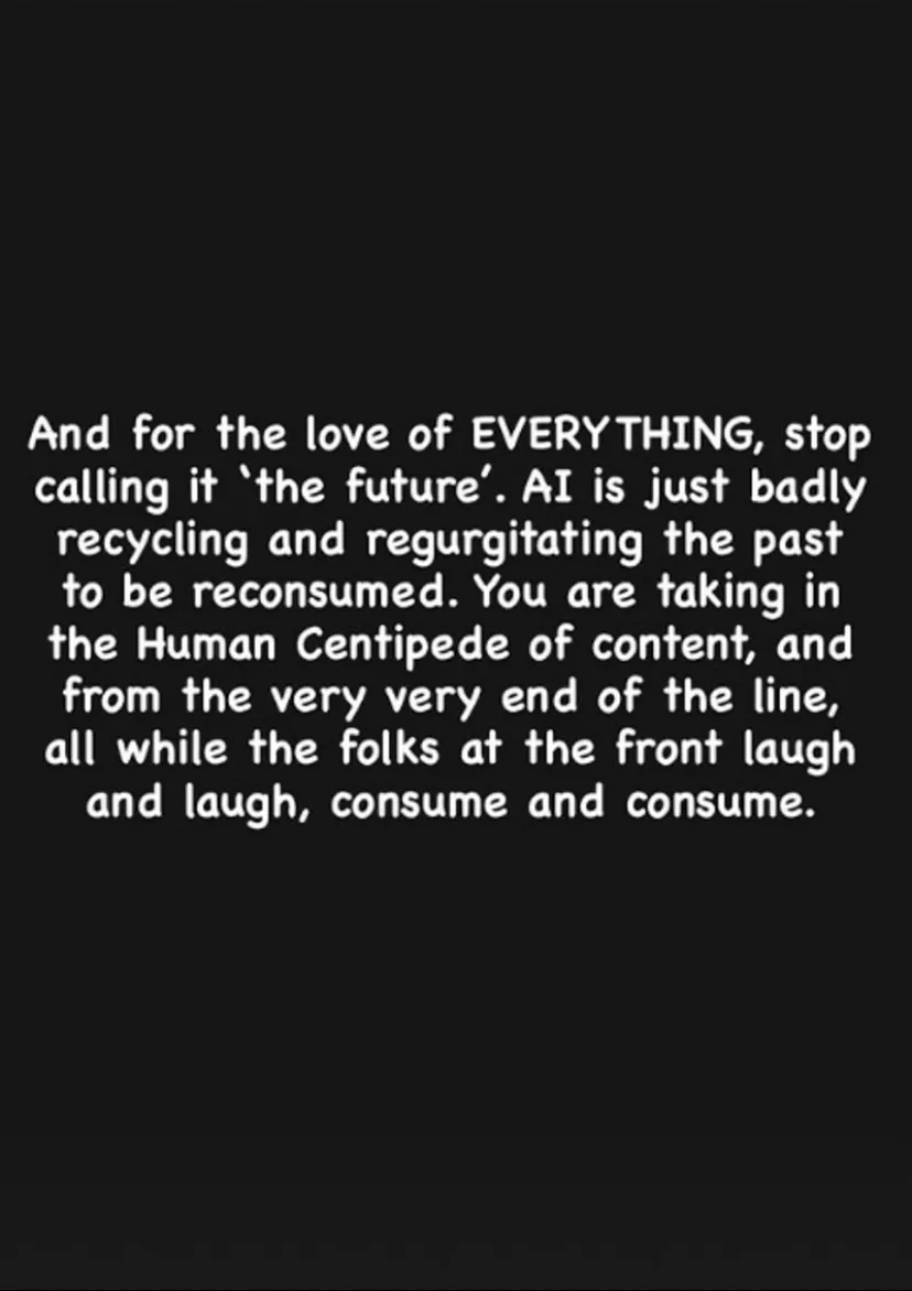 她駁斥「AI代表未來」的說法,認為人工智能只是在「回收與反芻」過去的內容,並非創作,「你正在從隊伍的最末端吸收「人體蜈蚣」(Human Centipede of content)式的內容,而前面的人只是一邊狂笑,一邊不停消費。」