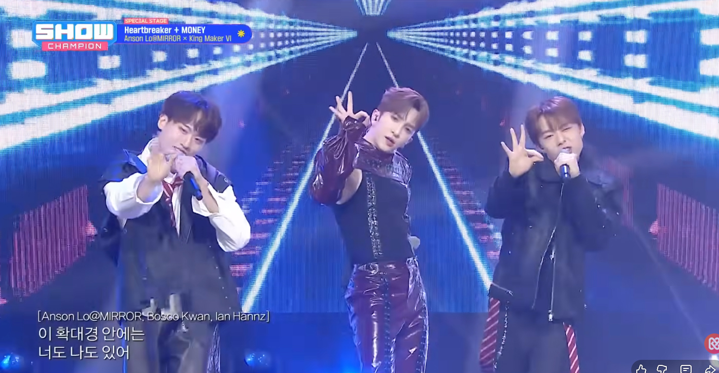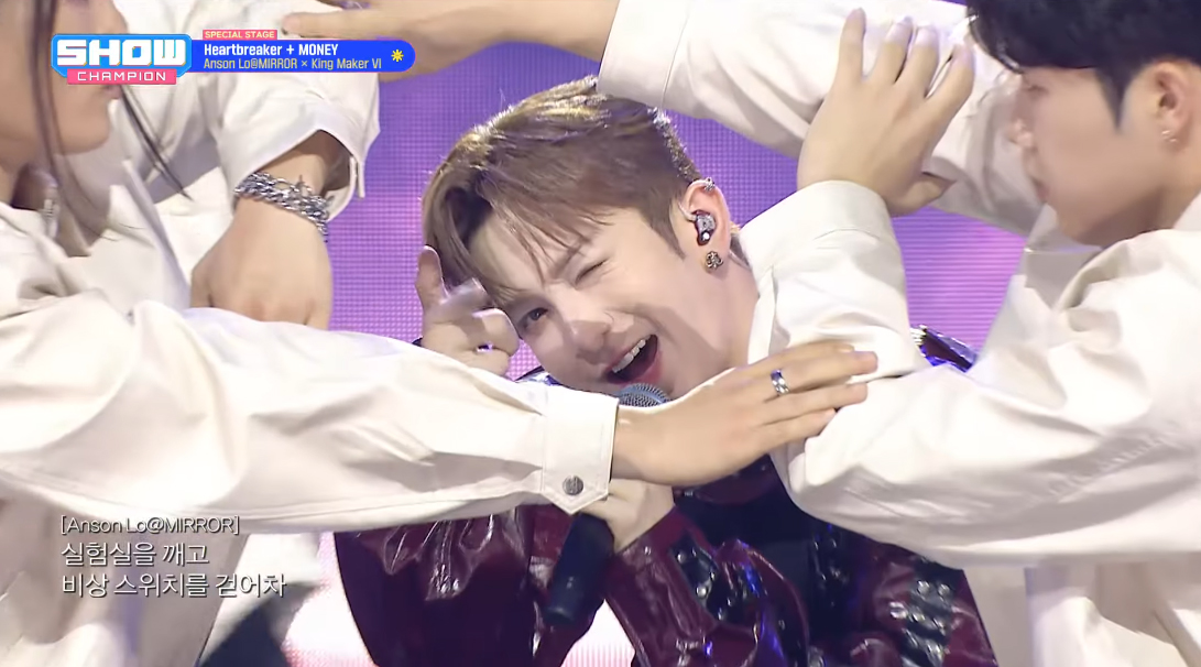 Anson Lo昨晨(14日)出席完品牌活動後,隨即出發到韓國錄影MBC電視台音樂節目《Show Champion》,同場還有男團KICKFLIP、台灣女團GENBLUE等。教主在節目中帶來2首大熱舞曲,以一身紅黑色亮面皮衣褲造型登場,首先SOLO唱出《Heartbreaker》,其後再與《全民造星VI》六位參賽者Gordon(張肇維)、Bosco Kwan(關曉隆)、Dave(黃日禧)、三金(榮柏鑫)、Ian Hannz(陳瑨羲)、及Larry(杜曦駿)合作帶來《MONEY》舞台。不少神徒都大讚教主及師弟們面對鏡頭都毫不怯場,壓台感超強,展現香港唱跳歌手的實力。