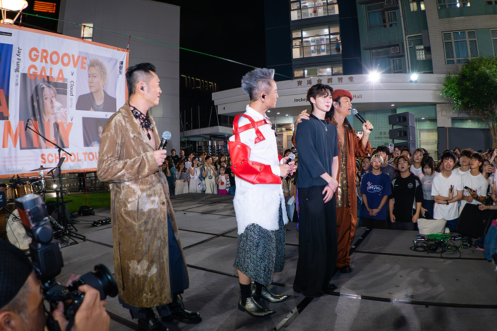 寰亞音樂年度活動「GROOVE GALA MA FAMILY SCHOOL TOUR」近日啟動,今年演出陣容包括馮允謙(Jay)、陳健安、黃淑蔓(Feanna)、雲浩影(Cloud)、樂隊Nowhereboys及新人盧慧敏(Amy Lo)等。其中在城市大學站的演出,更有「元祖級男團」草蜢特別演出。首次參與School Tour的草蜢表示感覺新鮮刺激。草蜢以《華麗舞台》打頭陣,台下學生們跟住唱,企第一排觀眾更緊貼舞台零距離。蔡一智說:「今日CityU嘅同學仔突破咗紅館第一行觀眾,因為依家紅館第一行都未必握到手。今日真係好近,一伸手就掂到!」他們邊說邊圍繞舞台與同學們握手和擊掌。
