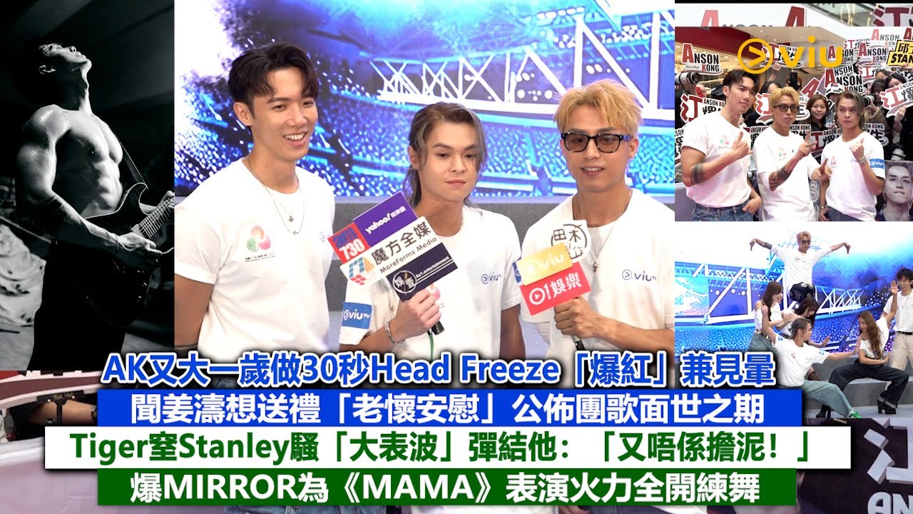 MIRROR成員Anson Kong、Stanley同Tiger今日出席ViuTV 《第十五屆全國運動會》記者會,AK喺玩遊戲時仲出大絕Head Freeze,Battle Fatboy嘅倒立同飛腳,仲谷到「紅都面晒」,笑認又大一歲Hold咗30秒後就開始見暈喇!講到生日,AK就口快快噏咗日前排團歌舞蹈時,姜濤竟然問自己想要咩禮物,不過仲未收到嘅,又大方公佈MIRROR團歌將於7周年時推出。