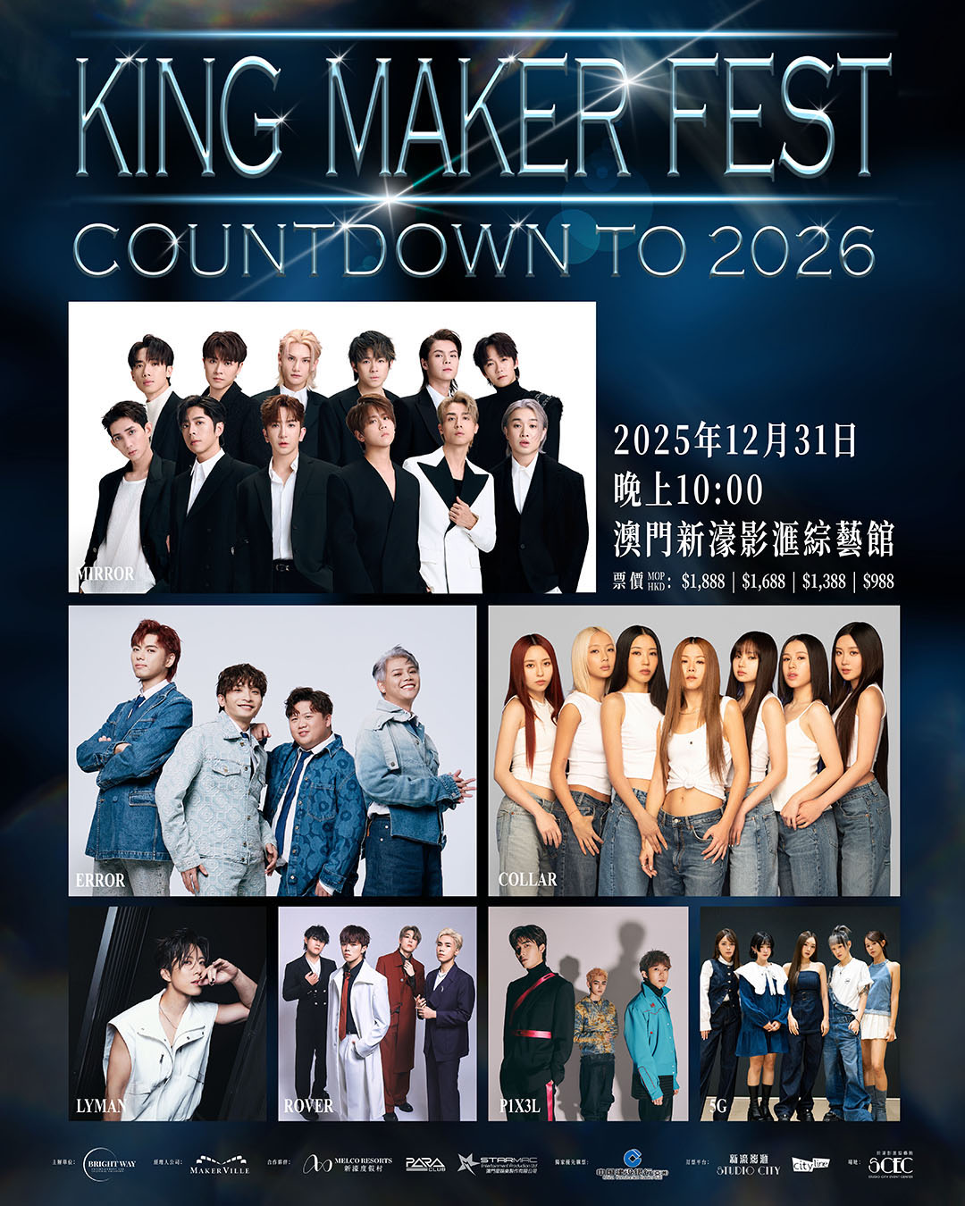 《King Maker Fest : Countdown to 2026》將於12月31日晚上10時,假澳門新濠影滙綜藝館舉行,參與團體包括MIRROR、ERROR、P1X3L、COLLAR、5G、ROVER,以及LYMAN(香胤宅)。全民造星家族成員屆時將聚首一堂,一同傾力演出,陪粉絲們用最澎湃的樂曲一起倒數,去舊迎新。票價分為$1,888、$1,688、$1,388及$988(港幣/澳門幣)。