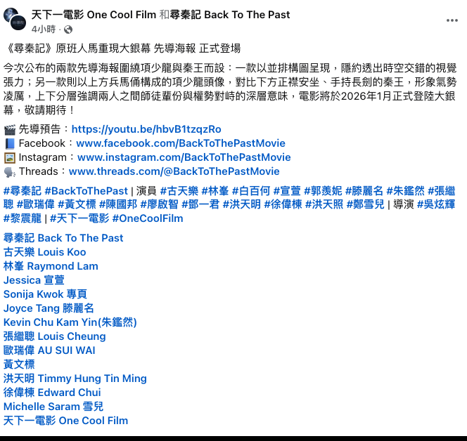 【Now.com】萬眾期待的《尋秦記》電影版終於確定上映日期!電影公司今日(26日)正式發布兩款先導海報,宣布這部由古天樂、林峯、宣萱等原班人馬演出的經典之作將於2026年1月登上大銀幕,讓苦等多年的劇迷興奮不已!