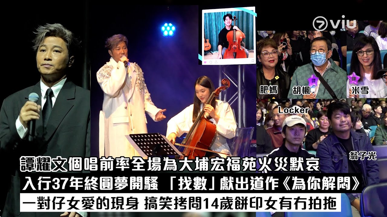 【Viu】譚耀文入行37年,今晚終於喺麥花臣舉行處男個唱《譚耀文In Full CHARACTER 演唱會》,獲老婆Fiona、愛女譚津如現身撐場!演唱會甫開始,身穿黑西裝嘅阿譚,率領一眾同樣着素服嘅表演嘉賓與樂手現身台前,一字排開為大埔宏福苑火災慘劇默哀,之後阿譚清唱英文歌《What The World Needs Now》送暖!