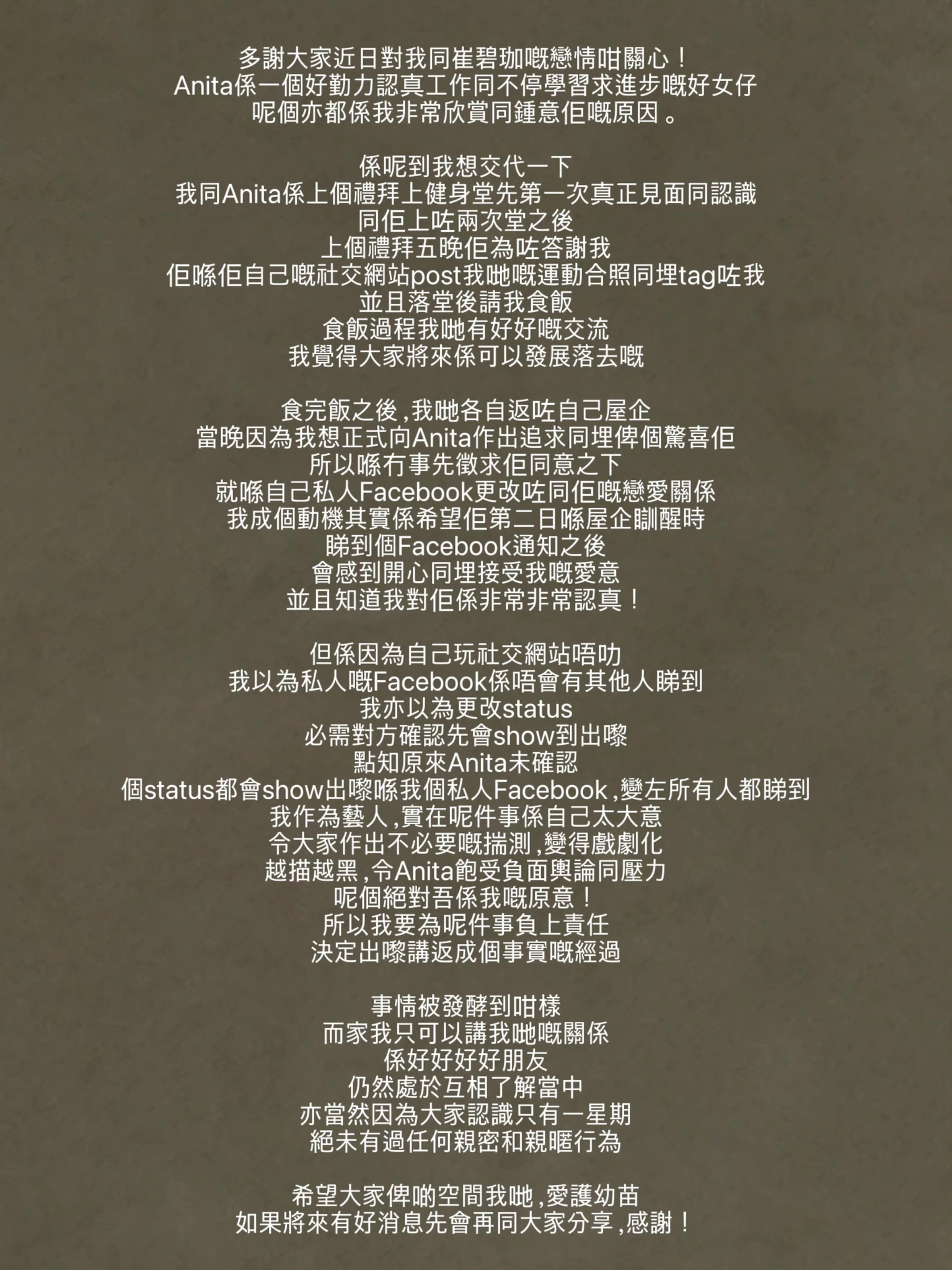 【Now.com】大隻Rocky鄭健樂早前在Facebook高調將感情狀況轉為「與Anita Chui戀愛中」,但崔碧珈Anita早前接受訪問時回應指兩人的關係並非情侶,而是「好好好好嘅朋友」。今日Rocky終於在Facebook發文回應事件,指是自己不了解社交媒體的操作導致的誤會,表示顯示兩人的關係是「好好好好朋友」。