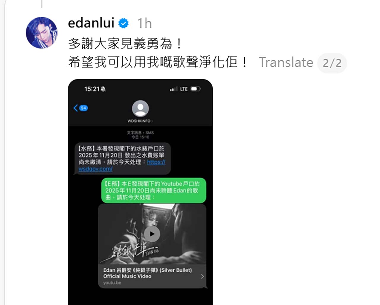 Edan隨後再更新帖文,「多謝大家見義勇為!希望我可以用我嘅歌聲淨化佢!」Edan用他的歌<純銀子彈>YouTube連結,回覆詐騙SMS,並附有「【E務】本E發現閣下的Youtube戶口於2025年11月20日尚未聆聽Edan的歌曲,請於今天处 (處) 理」。唔知Edan歌聲係咪可以淨化這個懷疑騙徒呢?