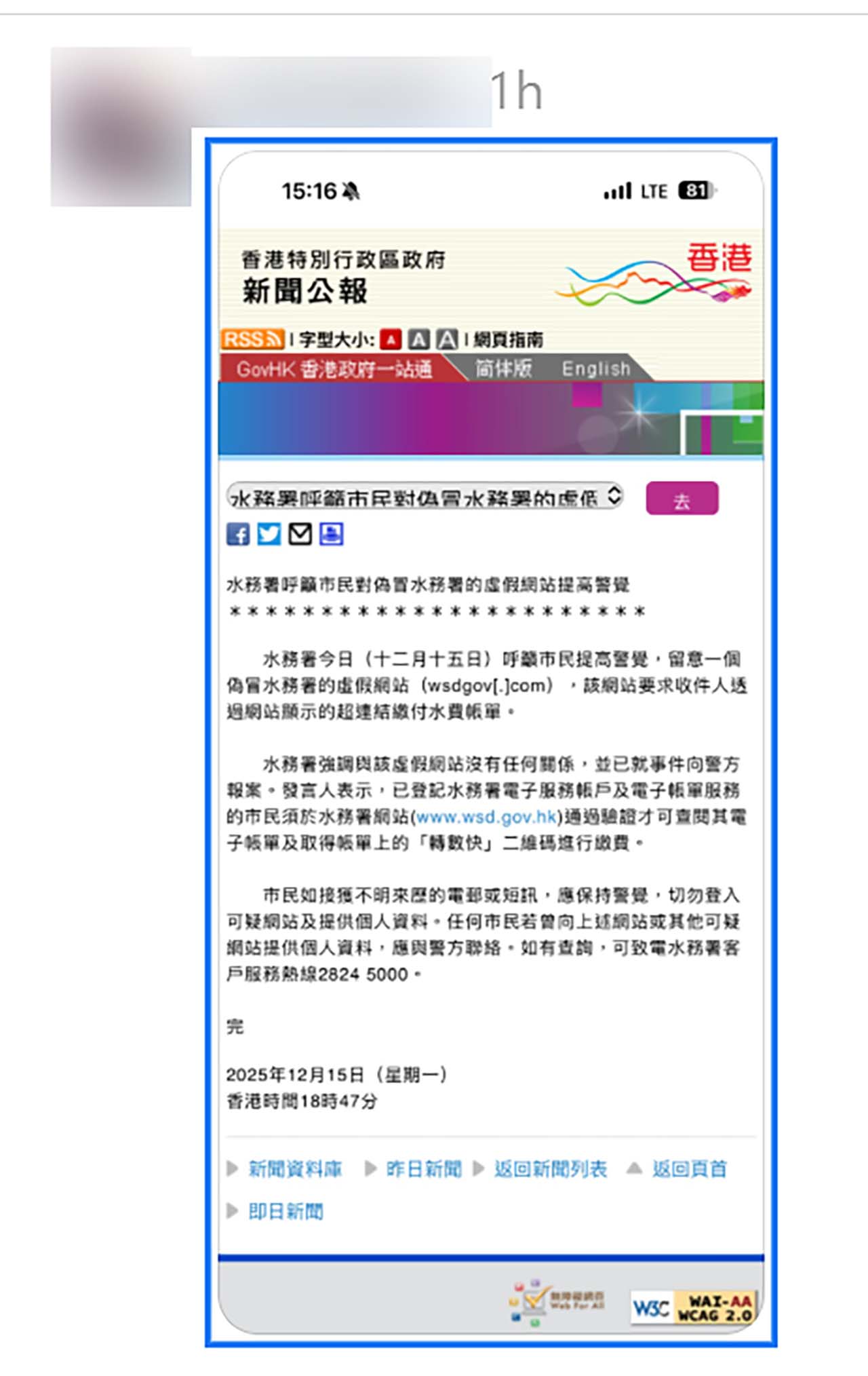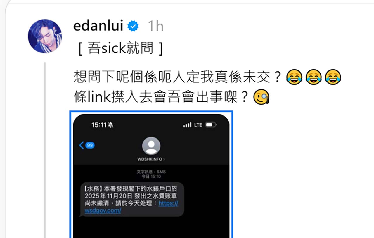 Edan在Threads的帖文稱「[吾sick就問]想問下呢個係呃人定我真係未交?😂😂😂 條link㩒入去會吾會出事㗎?🧐」帖文附上的是一張手機SMS截圖,寫著「【水務】本署發現閣下的水錶戶口於2025年11月20日發出之水账單尚未繳清,請於今天处理:(Link)」全文當中唯獨「賬」和「處」用了簡體字,明顯相當粗疏。