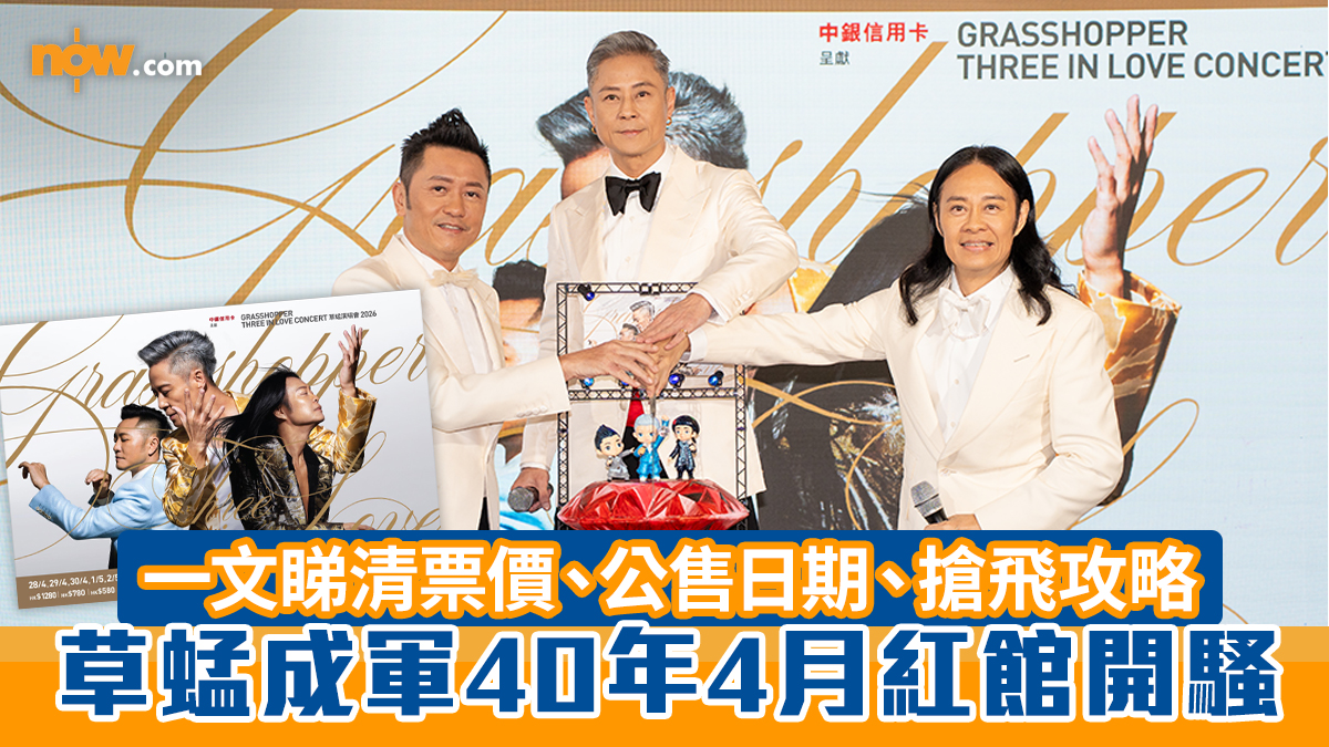 【Now.com】草蜢成軍超過40年,宣布將於4月28日至5月3日在紅館舉行一連六場《Grasshopper Three In Love 草蜢演唱會2026》,帶領粉絲進入用愛包圍的空間。即睇演唱會票價、座位表、搶飛日期及攻略!