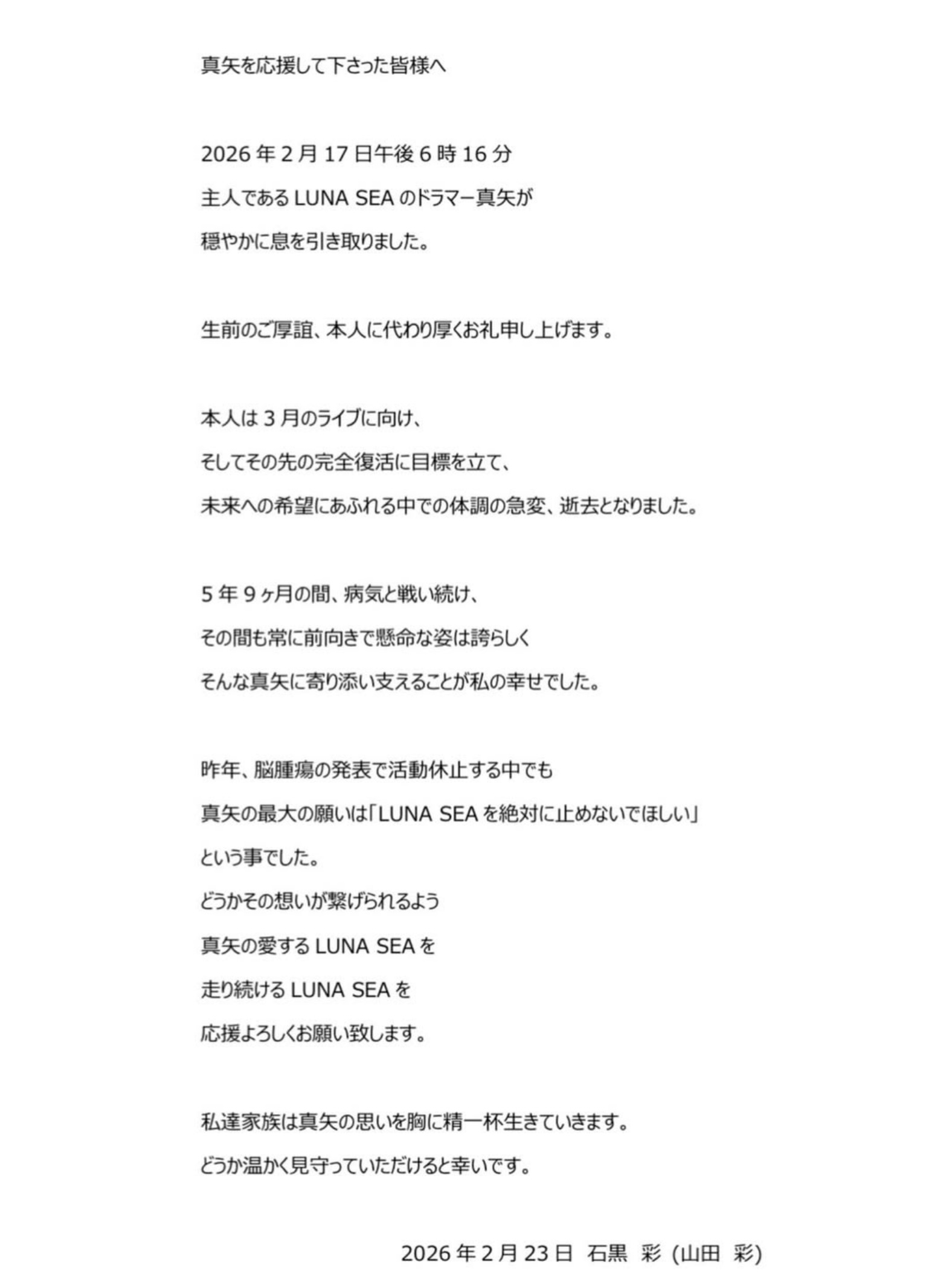 石黑彩在聲明中表示丈夫生前最大的願望就是「樂團LUNA SEA絕對不要停止活動」,所以希望LUNA SEA可以繼續樂團活動,亦深深感謝樂迷對樂團的支持。