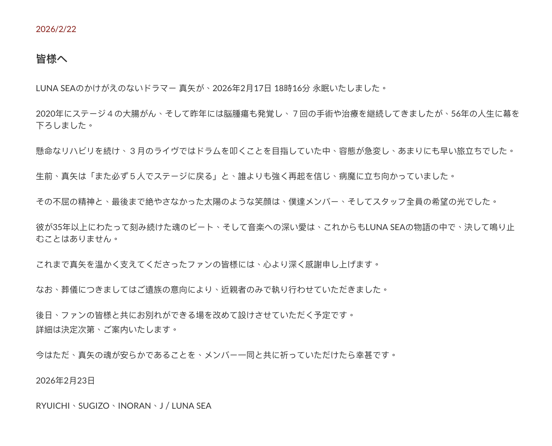 根據LUNA SEA的其他成員共同發表的聲明,指真矢即使面對第四期大腸癌和腦腫瘤,依然堅強面對,比任何人也熱愛LUNA SEA和希望LUNA SEA全員可以再在舞台上為粉絲演出,一眾成員會記住真矢不屈不撓的精神,以及帶給樂團各位成員和工作人員溫暖的笑容。