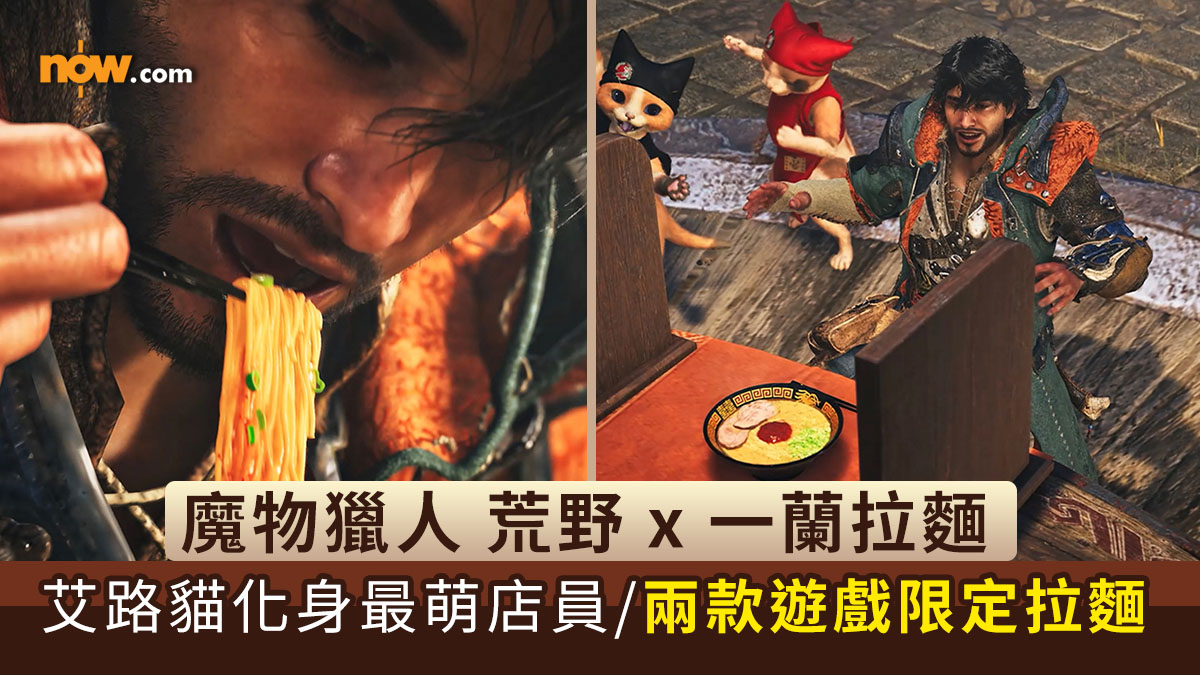 【Now.com】召集各位魔物獵人!遊戲《魔物獵人 荒野》(Monster Hunter Wilds) 宣布與日式拉麵店一蘭拉麵聯乘,推出期間限定活動,活動期間,可愛的艾路貓會穿上店員服飾,而平日玩家可以點的「貓飯」,亦會加入兩款拉麵,有特別餐點技能。