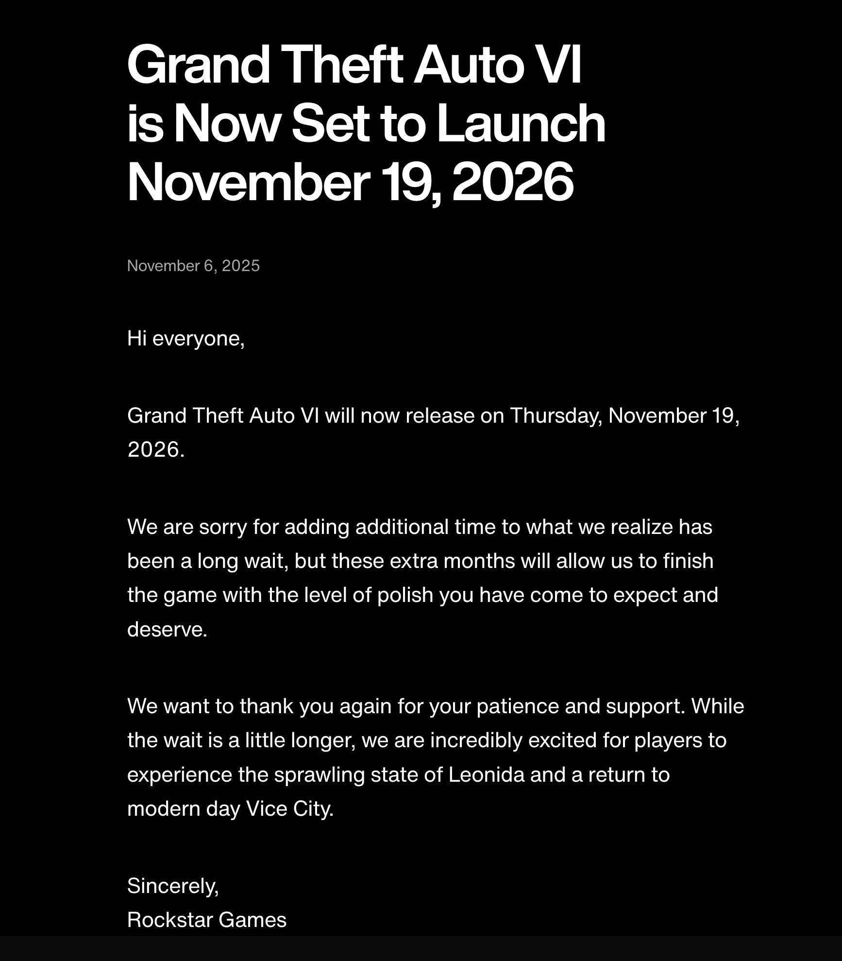 遊戲開發商Rockstar Games於官方網站宣布,遊戲《Grand Theft Auto VI》將會延期至2026年11月19日上架。開發商在公告中道歉,指明白遊戲迷已經等了很久,但表示今次的延期可讓團隊確保遊戲成品的質素,令粉絲可以玩到高質素的遊戲。