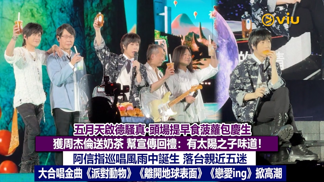 五月天今年喺生日周嚟到香港開騷,趁29日正日生日前,大會攞咗以菠蘿包砌出嚟嘅生日蛋糕同五子慶祝,阿信仲點名感謝周杰倫隔空送上飲品祝賀,笑話飲得出「太陽之子」嘅味道,順便幫周董嘅新碟宣傳,堅係老best!阿信更食住菠蘿包唱《突然好想你》添!另外,五子喺第一個encore位唱咗《私奔到月球》、《倔強》,又同五迷細訴喺香港開騷嘅一點一滴,依家先睇實況片!