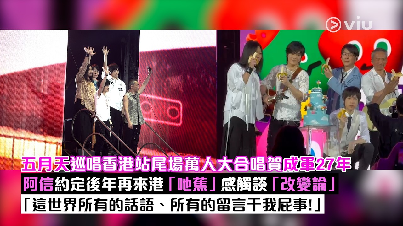 【Viu】《五月天 [#5525+1回到那一天] 25週年巡迴演唱會2026 香港站》今晚尾場,適逢係五月天成軍27年嘅大日子,梗係要推個蛋糕出嚟慶祝啦,仲有萬人大合唱生日歌,阿信仲突然掟蕉出嚟畀大家食,又話要剩返半條留返後年嚟香港再食,即係暗示五月之約將於後年再續!