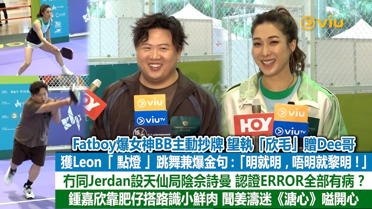 【Viu】鍾嘉欣同Fatboy@ERROR今日出席Pickleball活動,仲落場切磋球技,Fatboy同隊友最後成功以15:11贏咗嘉欣x前奧運金牌得主李小鵬,威呀!Fatboy話之前有同小鵬打波,互有輸贏,仲沾沾話圈中人得許廷鏗可以同自己匹敵,姜濤只會畀自己「羞辱」,師傅好大口氣噃!Fatboy又話第一次見嘉欣心心眼,估唔到女神主動問自己「抄牌」,仲爆隊友Dee原本想跟埋嚟追星,奈何撞咗電影宣傳,笑言要執條毛送畀Dee哥。