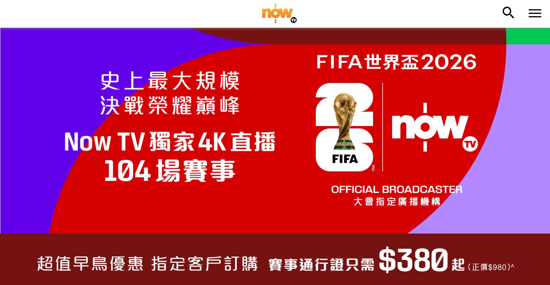 今屆世界盃由 Now TV 香港獨家直播全部104場賽事,並提供高清及4K畫質選擇。收看賽事需要購買「Now TV FIFA世界盃2026賽事通行證」。賽事將於Now TV頻道616、617、618及/或619台播放。所有賽事均設有點播重溫功能,方便大家隨時追返精彩入波!