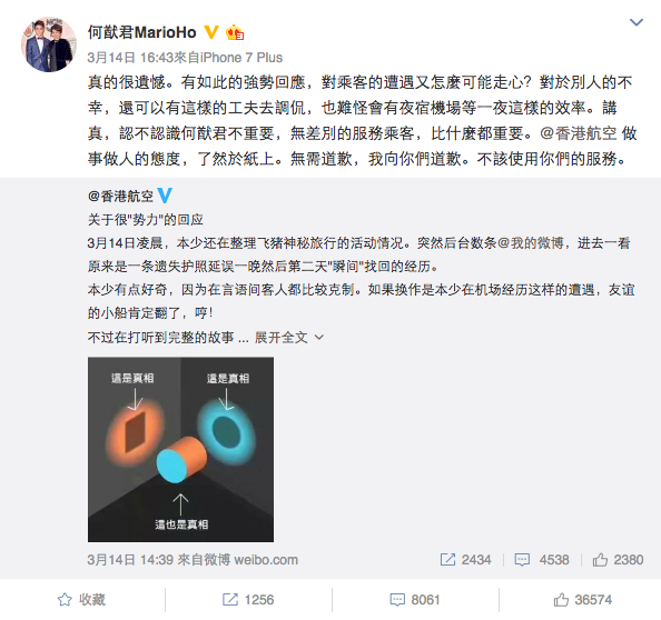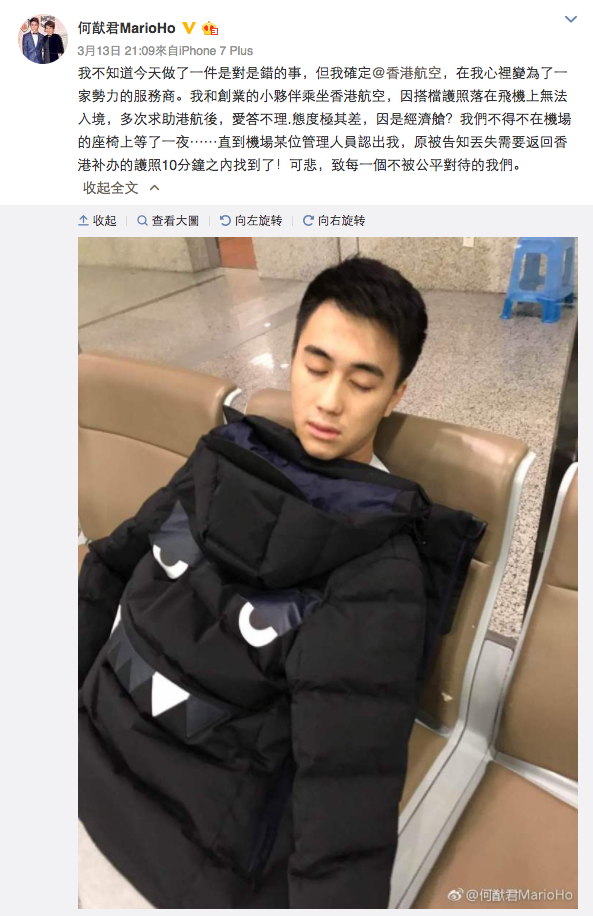 何鴻燊兒子何猷君於微博發文,話自己同朋友乘坐香港航空的班機前往上海,朋友護照遺留機上,求助航空公司不果,晚上要滯留機場等過夜。(微博截圖)