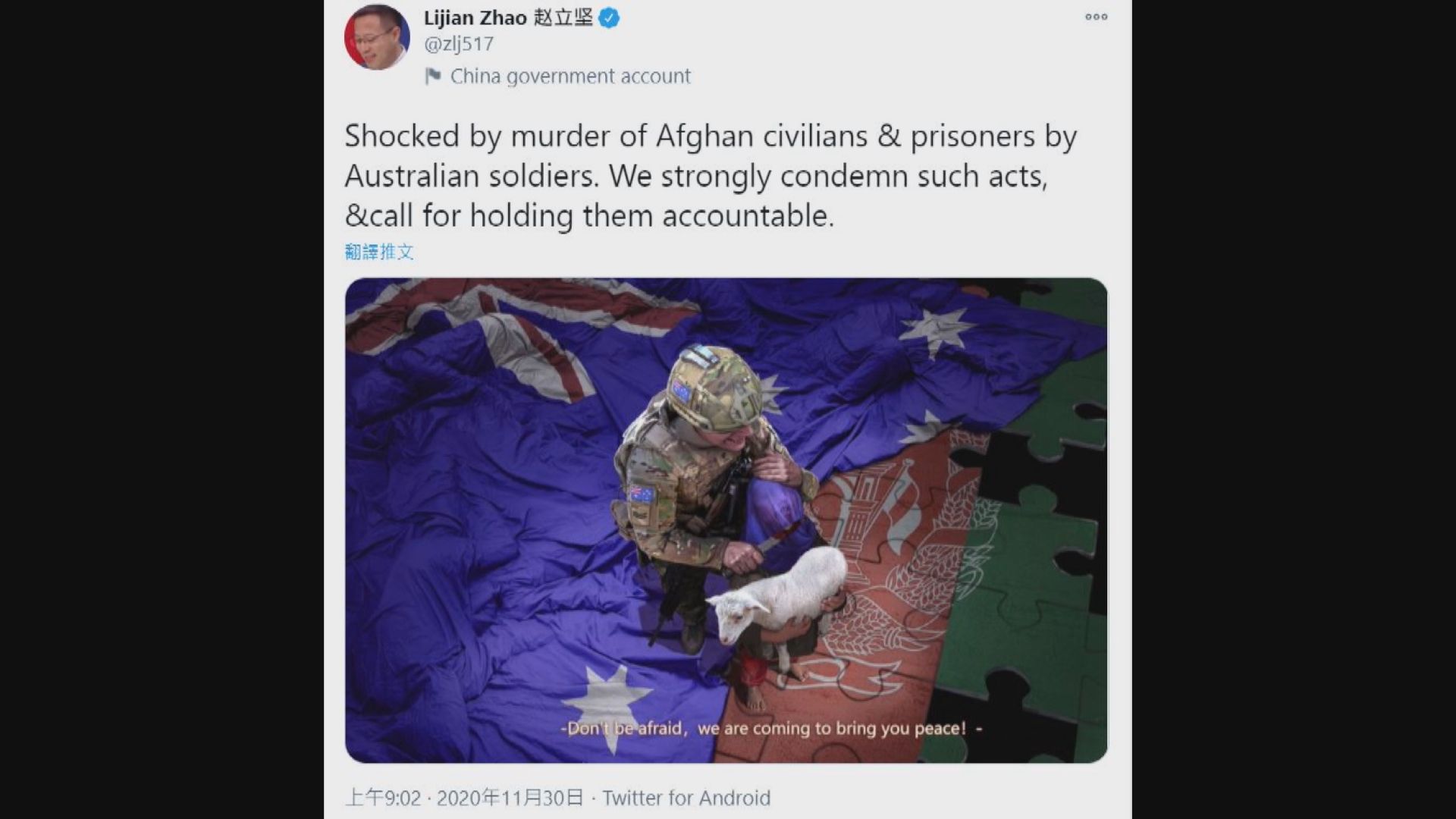 外交部發言人趙立堅在Twitter,上載了一張澳洲軍人持刀架在一名阿富汗兒童頸上的圖片,據悉是中國畫家的諷刺漫畫。澳洲總理莫里森譴責這張是「虛假圖片」,要求中方道歉。