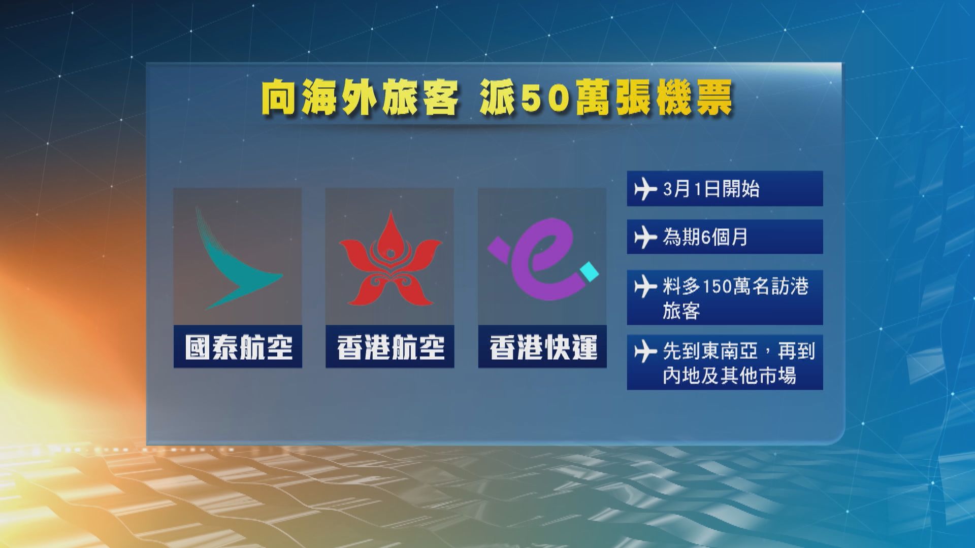 三間本地航空公司,包括國泰、香港航空及香港快運,將會由下月一日開始送出50萬張機票予旅客,透過舉辦抽獎、遊戲、買一送一等方式送出。這50萬張機票是由機管局資助,在2020年已用約20億元向航空公司預購。