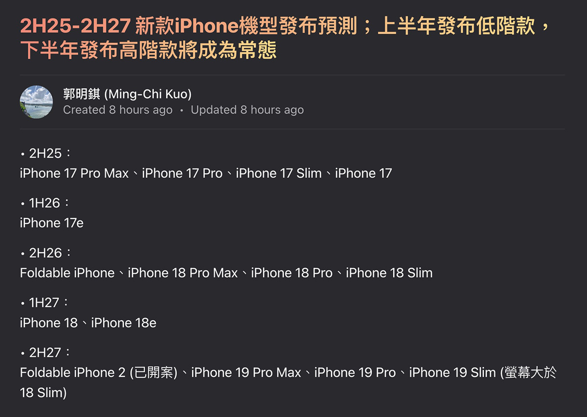 另外值得一提的是,2026 下半年開始,Apple 可能在秋季發佈會集中發表高端機型如 Pro 系列、Slim 及傳聞的摺屏手機,而將標準版 iPhone 及 e 系列延後。