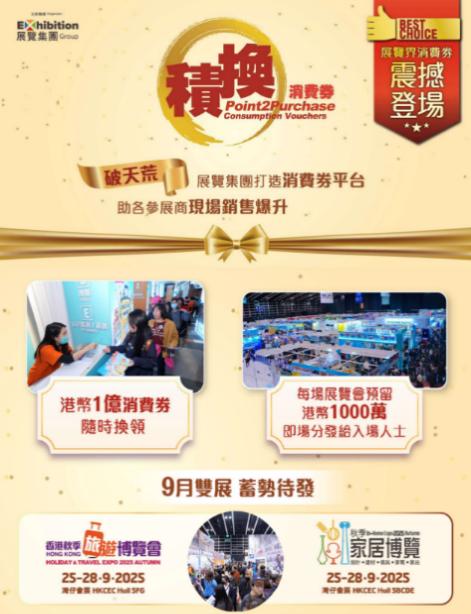 為推動本地消費,展覽集團推出總值逾一億港元的「積換‧消費券計劃」,首階段讓獎賞平台The Club會員可將累積積分,兌換為展覽限定消費券,計劃將涵蓋集團全年11個展覽活動,並於9月25至28日舉行的「香港秋季旅遊博覽會2025」及「秋季家居博覽2025」率先試行。